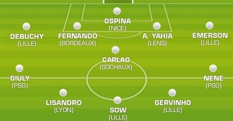 La formation type de cette 16e journée fait évidemment la part belle aux Lillois, vainqueurs de Lorient (6-3). Outre Sow (3 buts), Gervinho a été intenable tandis que Debuchy et Emerson ont largement contribué à ce carton avec leurs montées. Les couloirs, c'est aussi ce qui fonctionne le mieux à Paris en ce moment avec la jeunesse retrouvée de Giuly et la patte de Nêne (9e but). Auteur d'un doublé, Lisandro Lopez retrouve la forme et Lyon avec (5e). Replacé récupérateur, le défenseur Sochalien Carlao a ratissé et marqué le premier but face de son équipe. Impérial dans les duels, le Lensois Yahia a colmaté toutes les brèches de la défense nordiste et y est allé de son petit but. Fernando a égalisé in-extremis pour Bordeaux à Saint-Etienne et le gardien niçois Ospina a repoussé toutes les attaques marseillaises. Une performance puisque jusque-là, l'OM avait toujours inscrit au moins un but à l'extérieur cette saison.